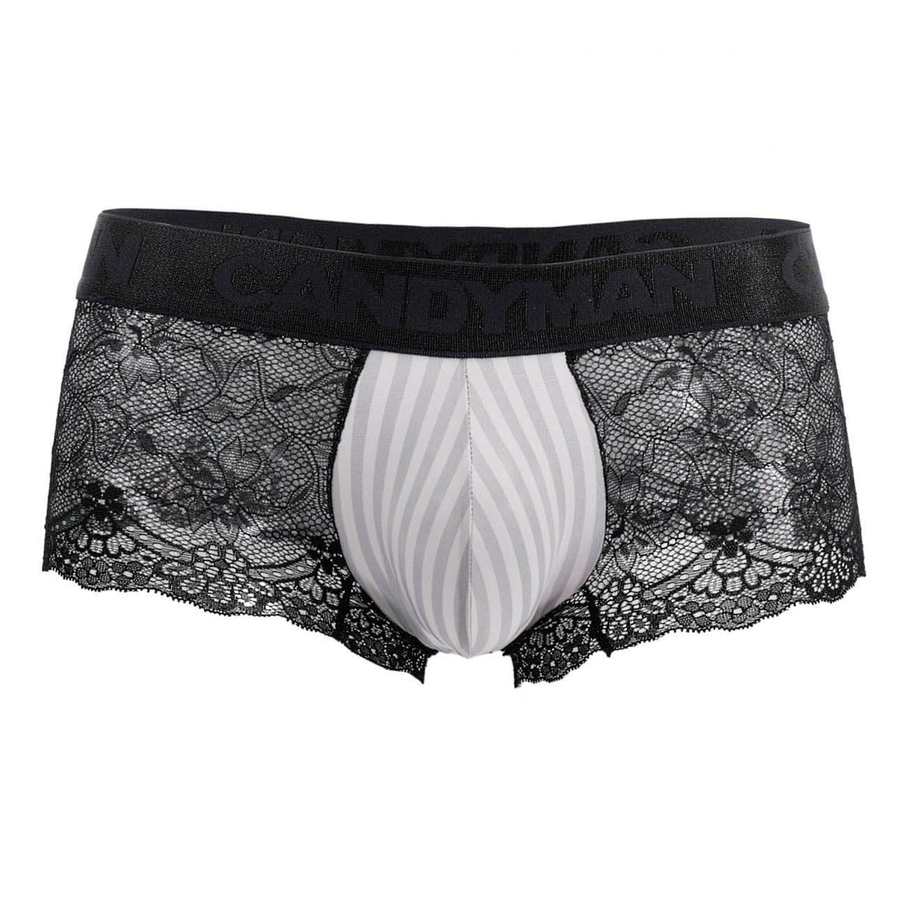 Boxer Candyman 99415. Boxer très sexy avec de la dentelle sur le boxer sauf sur la poche avant qui est rayée. Ceinture élastique logotée Candyman. A porter sans modération, lors d’ une soirée chic et sensuelle. 85% Polyamide, 15% Elasthanne.