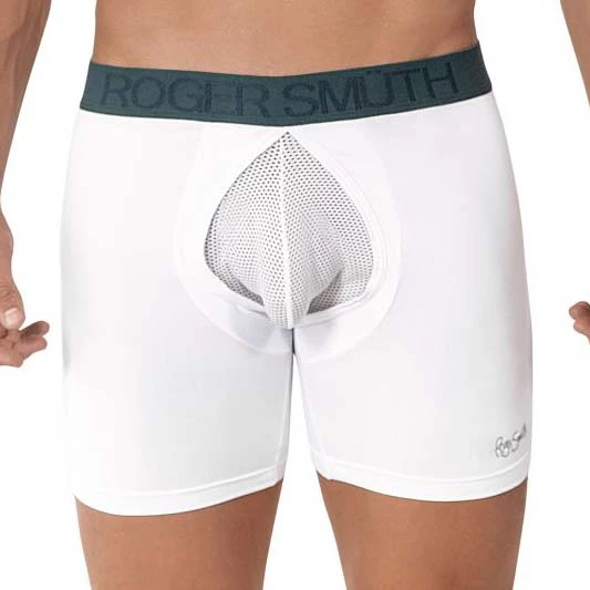 Boxer Roger Smuth RS010. Boxer très sportif grâce Ă son empiècement en tissu mesh sur la poche avant du Boxer et Ă l’arrière. Ceinture Ă©lastique logotĂ©e au nom de la marque. 87% Nylon, 13% Elasthanne.