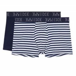 HOM Pack de 2 Boxers Christofer. Lot de 2 Boxers, l’un est uni et l’autre rayé en coton stretch. Coque élastiquée : confort et mise en valeur du sexe. Maintien sans compression. La matière est facile à porter, confortable dans le mouvement, sous tout type de vêtement. Sur la ceinture bleue marine de chaque boxer, le logo HOM est présenté en largeur avec un jeu de contraste de couleur blanche. 95% Coton, 5% Elasthanne.