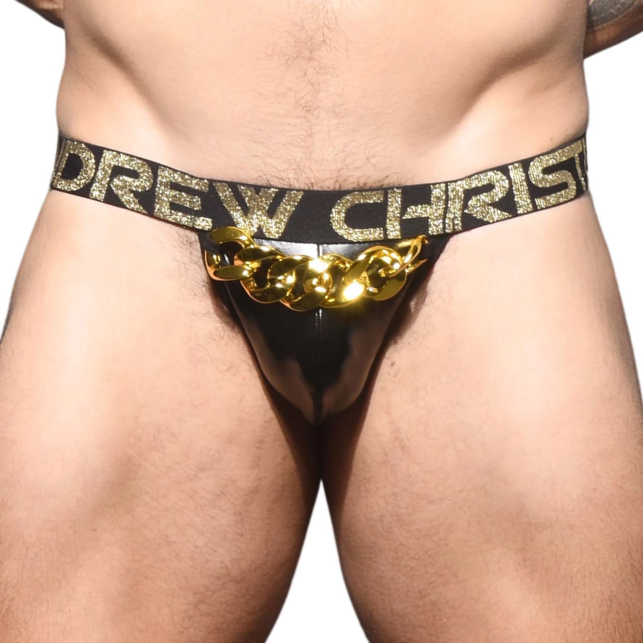 Jock Strap Andrew Christian Chains of Love 92107. Jock Strap avec une chaine dorée sur le haut de la poche frontale. Ceinture élastique logotée Andrew Christian. Poche avant qui offre un excellent maintien. Tissu aspect cuir, vous allez adorer le porter. 92% Polyester, 8% Elasthanne.