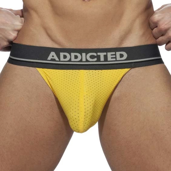 Jock Strap Cockring Addicted Mesh AD924. Jock Strap très confortable et très sexy. Vous allez adorer sa poche frontale Push up avec la technologie RingUp intégrant un cockring amovible en silicone pour un effet push Up Maximal. Matière légère en mesh. Large ceinture élastique logotée AD. Possibilité d’acheter un autre cockring référence AC054 sur le site. 80% Polyamide, 10% Elasthanne, 5% Polyester, 5% Viscose.