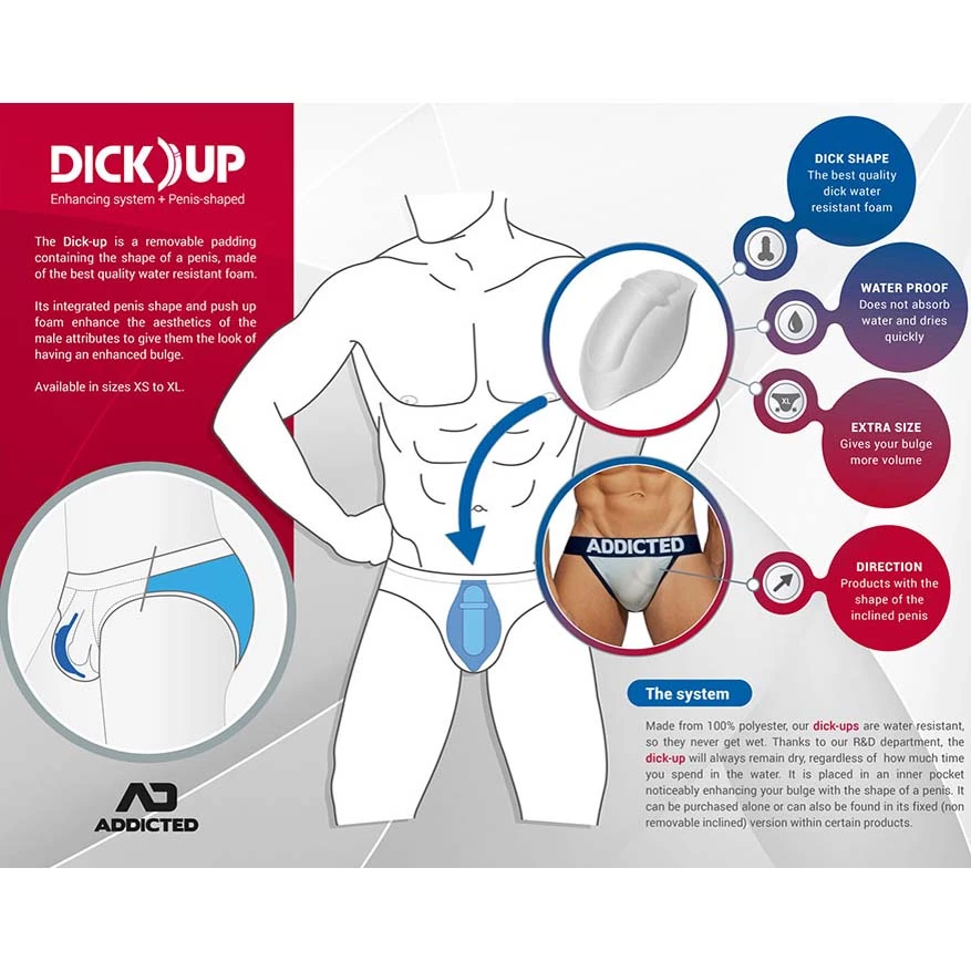 Slip Addicted Dick Up AD815. Slip très confortable et très sexy. Vous allez adorer sa poche frontale avec le systeme Dick Up intégré et non amovible pour un effet push Up Maximal. Ce système reproduit les carractéristiques de votre sexe pour un effet naturel. Matière légère et aérée grâce au tissu mesh. Large ceinture élastique logotée AD. Imprimé 75% Polyamide, 20% Elasthanne, 5% Coton.